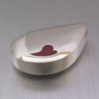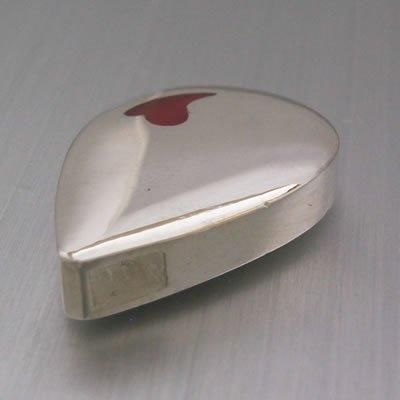 ハートを共通のデザインにしピアスとのペアに。ペンダントには赤色の樹脂を埋め込み全体を鏡面に磨く事でツルンとしたイメージに仕上げました。