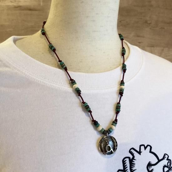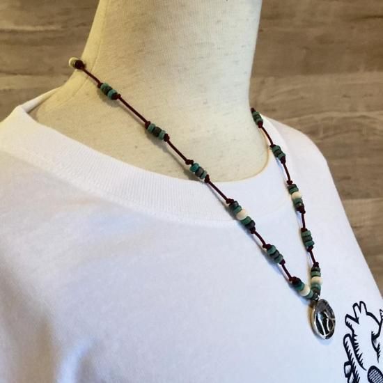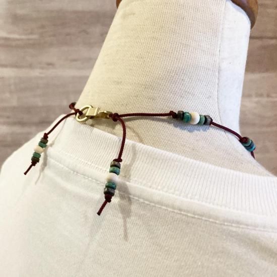 エンジ色の紐にセットしたビーズは白いウッドビーズと水色と黒のココナッツビーズ。 br> 少し印象的な色使いかなと思います。